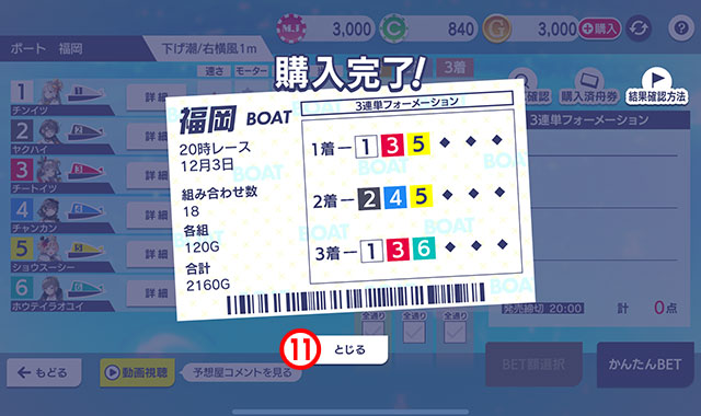 このレースでは3連単(1着・2着・3着の順番)を予想して舟券を購入します。