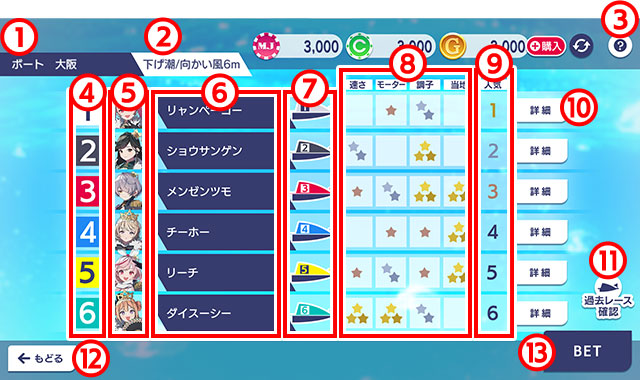 - 各キャラクターの枠番です。枠番の色はボートの色と連動しています。