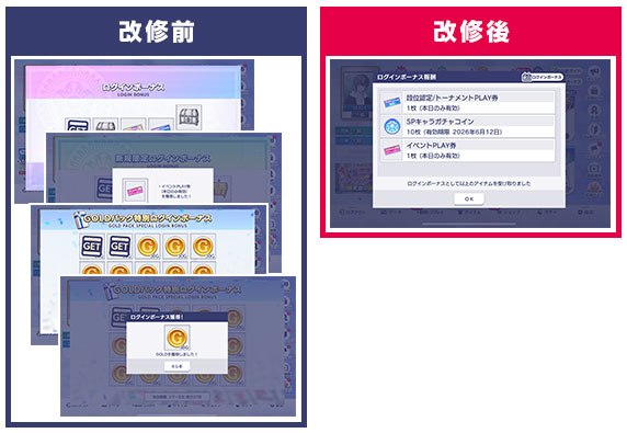 各種ログインボーナス獲得演出をなくし、獲得できるアイテムを一度にまとめて表示するよう改修します。