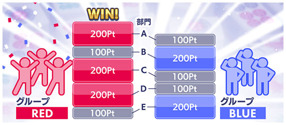 グループの勝敗は、イベント終了時に、各グループメンバーの対局結果を集計し、集計結果を様々な部門で勝敗を決めて、獲得したグループポイントの合計値で判定します。
